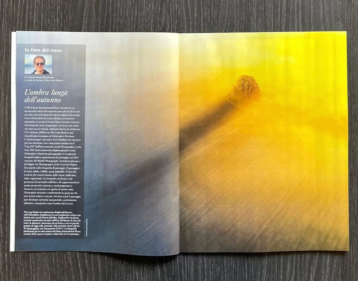 "The SIPA–Siena International Photo Awards (www.sienawards.com) has in just a few years become one of the most prestigious photographic competitions in the world. As is often the case with major events, the Drone Photo Awards—linked to aerial photography (especially taken via drones but also from other flying vehicles)—is associated with it. This year we celebrate the 11th edition (2025) with The Long Shadow, an extraordinary image by Christopher Harrison.