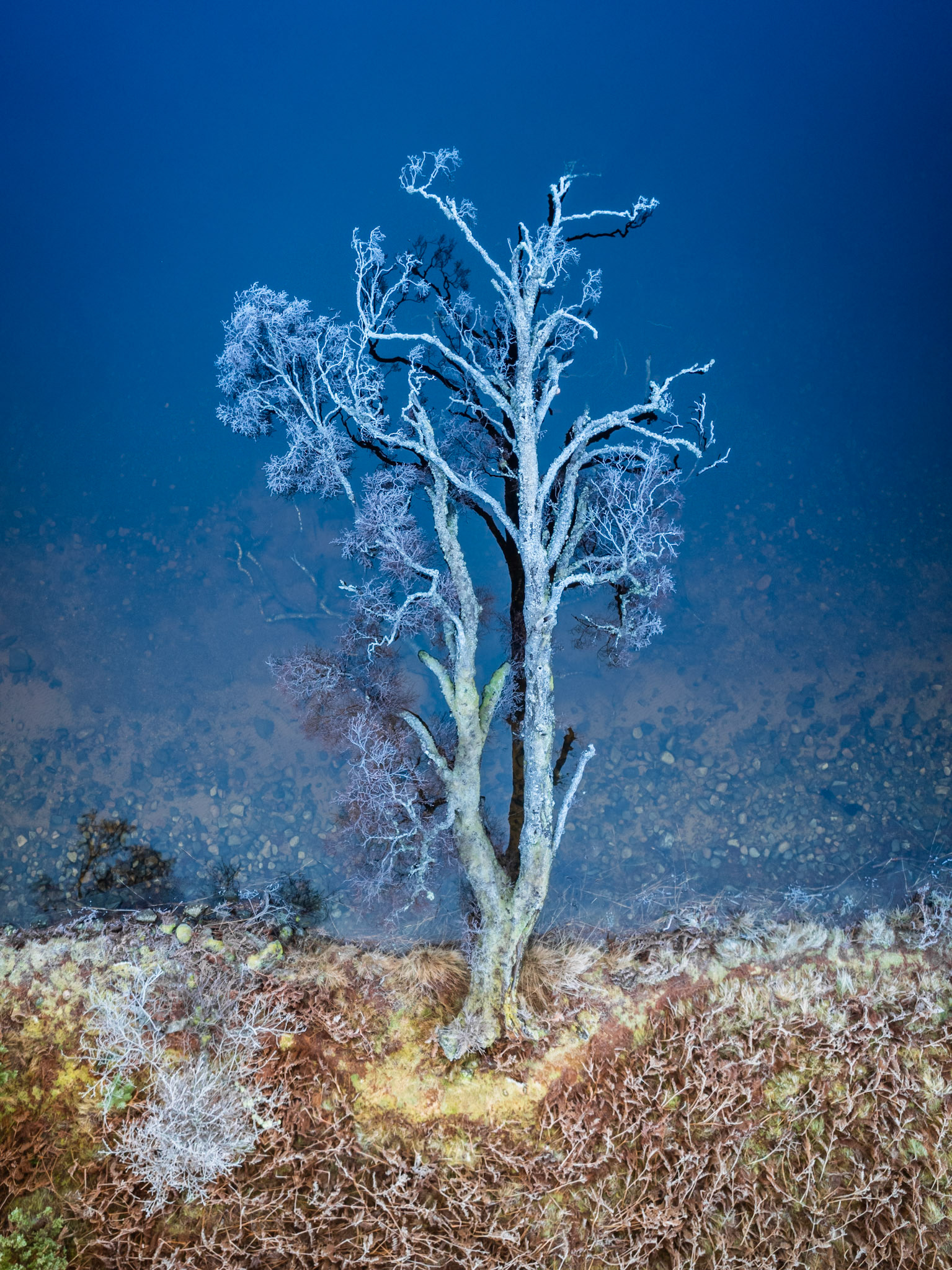 To capture this scene, I used my DJI Mavic 3 Pro drone, hovering just above tree height. By shooting down towards the tree, the deep blue water of the loch became a clean, vivid backdrop. This shift to an aerial perspective turned the scene into a semi-abstract photograph, perfectly highlighting the fantastic, intricate skeletal structure of the frozen branches against the dark water. It almost looks like the blue water of the loch is the sky, challenging the viewer to think twice about the photograph. Some have also said it looks like it is underwater, which I agree with.
