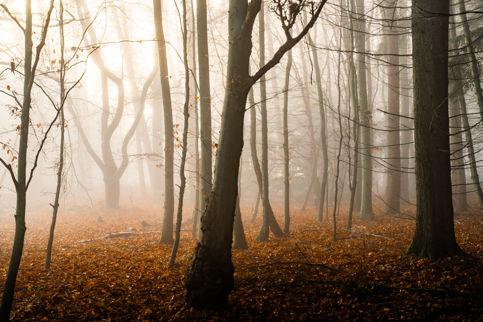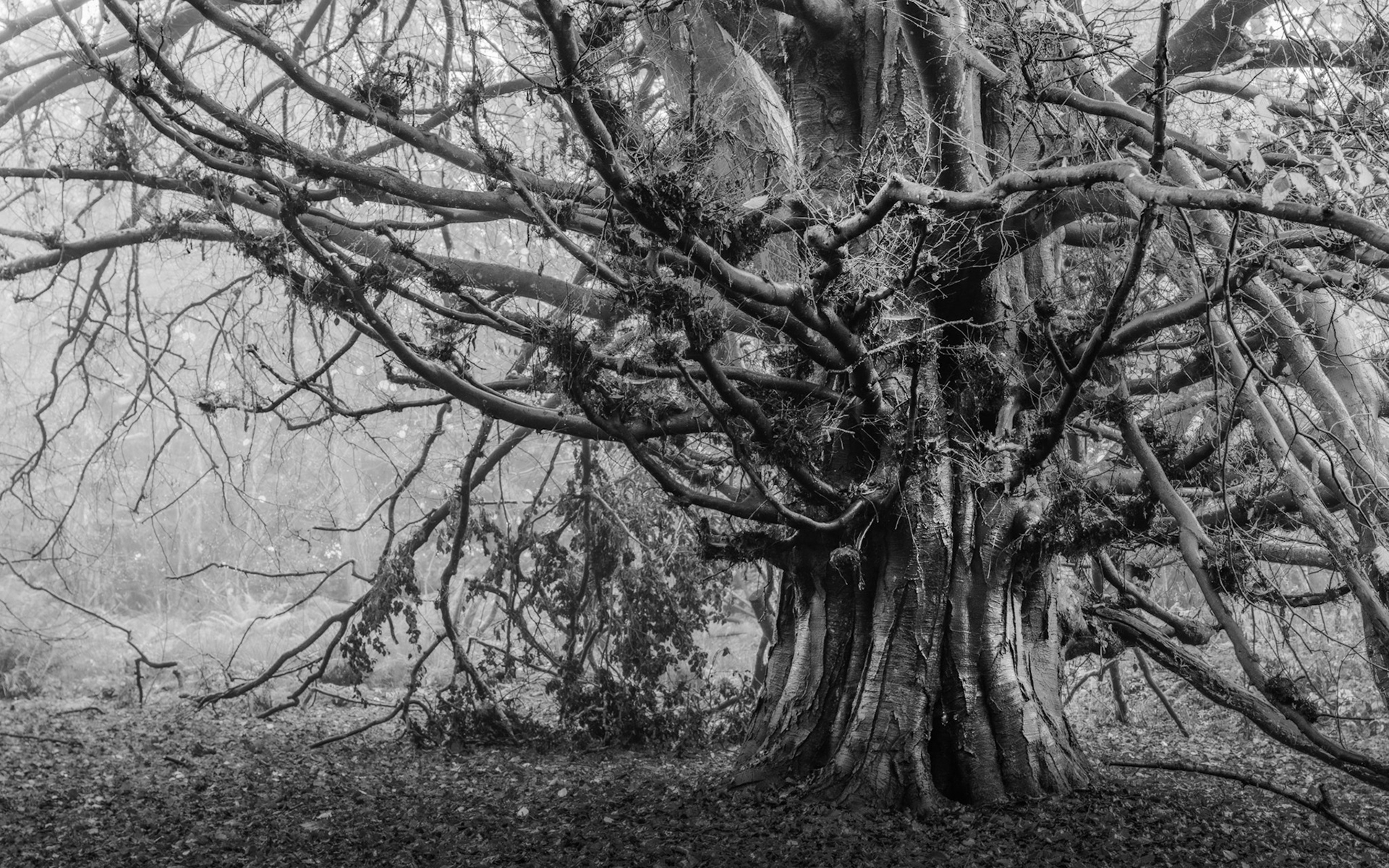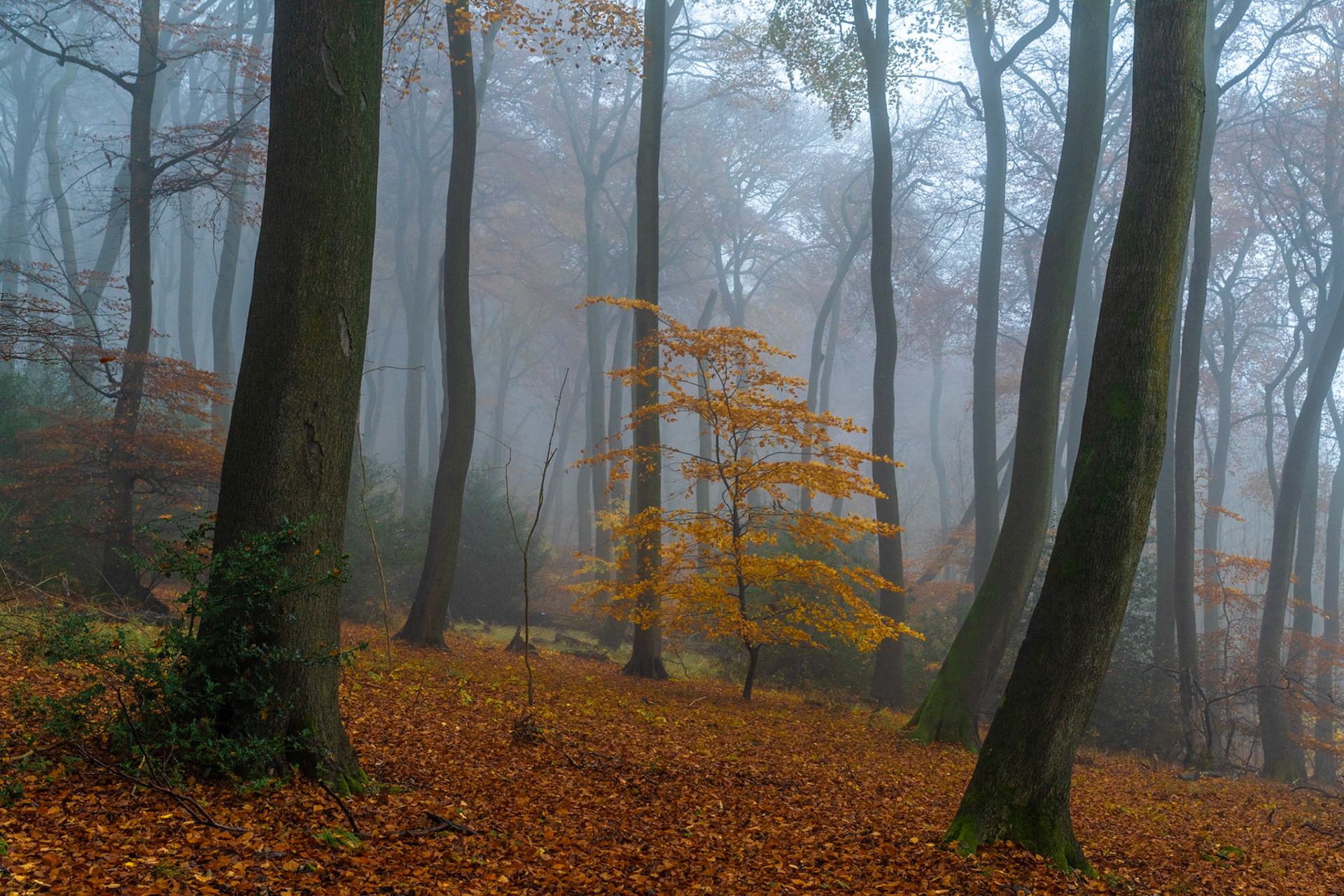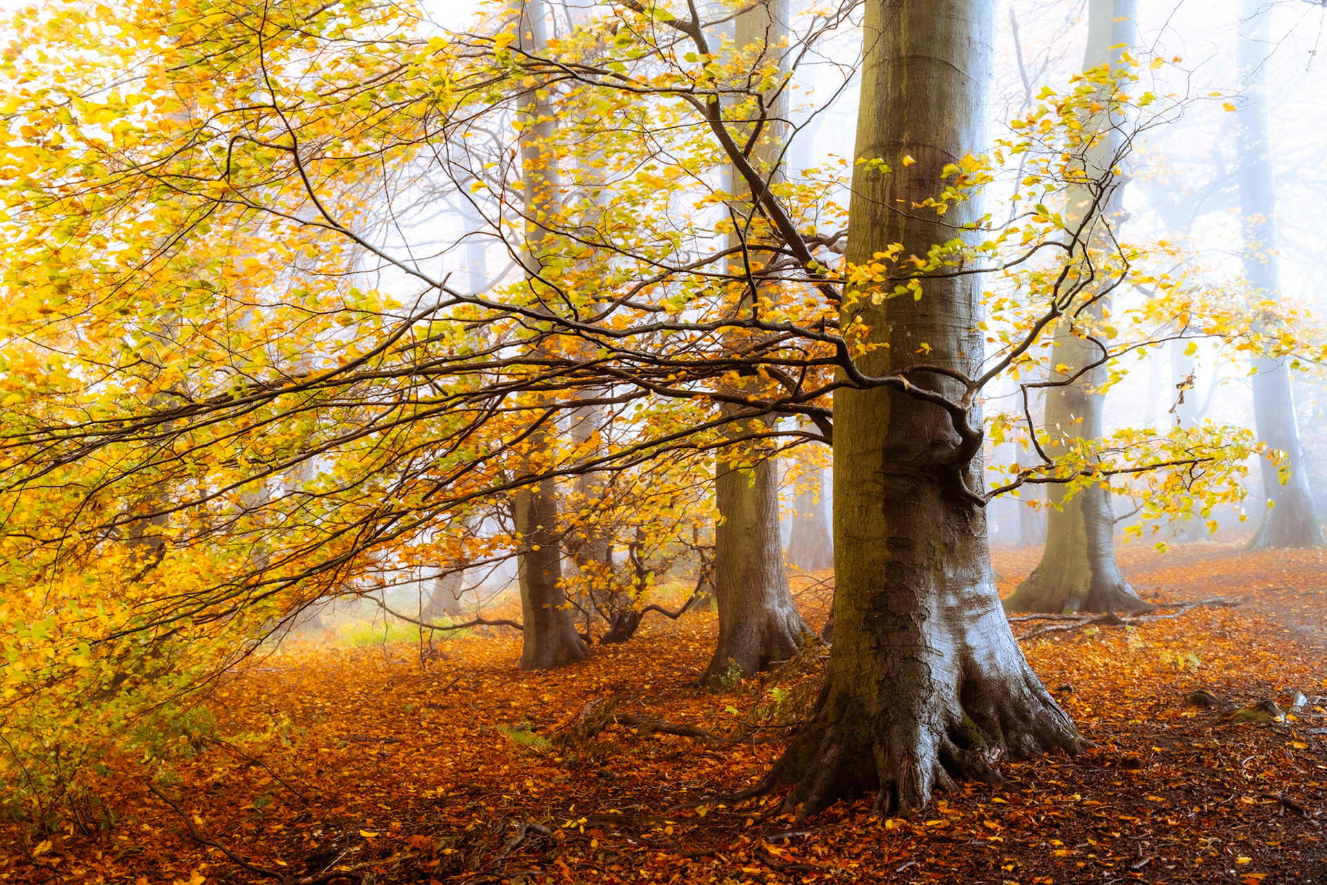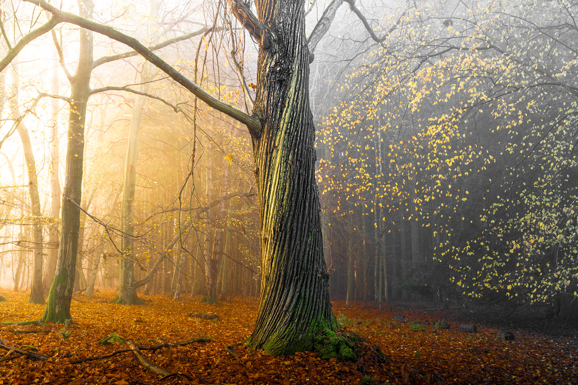 The lower branches of this Beech tree stand alone against it's neighbouring trunks. Golden leaves stand out against the fog, creating a brilliant focal point.