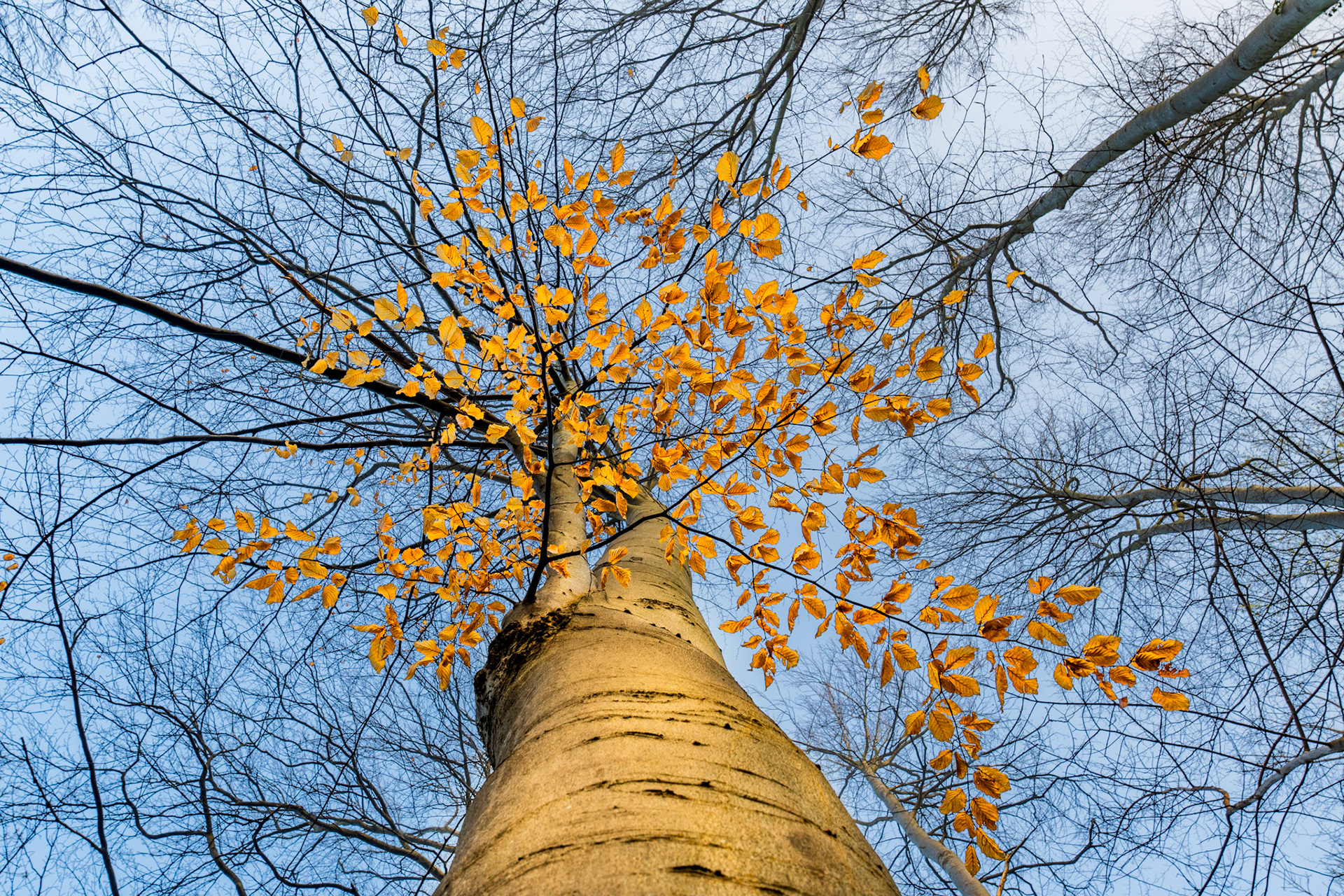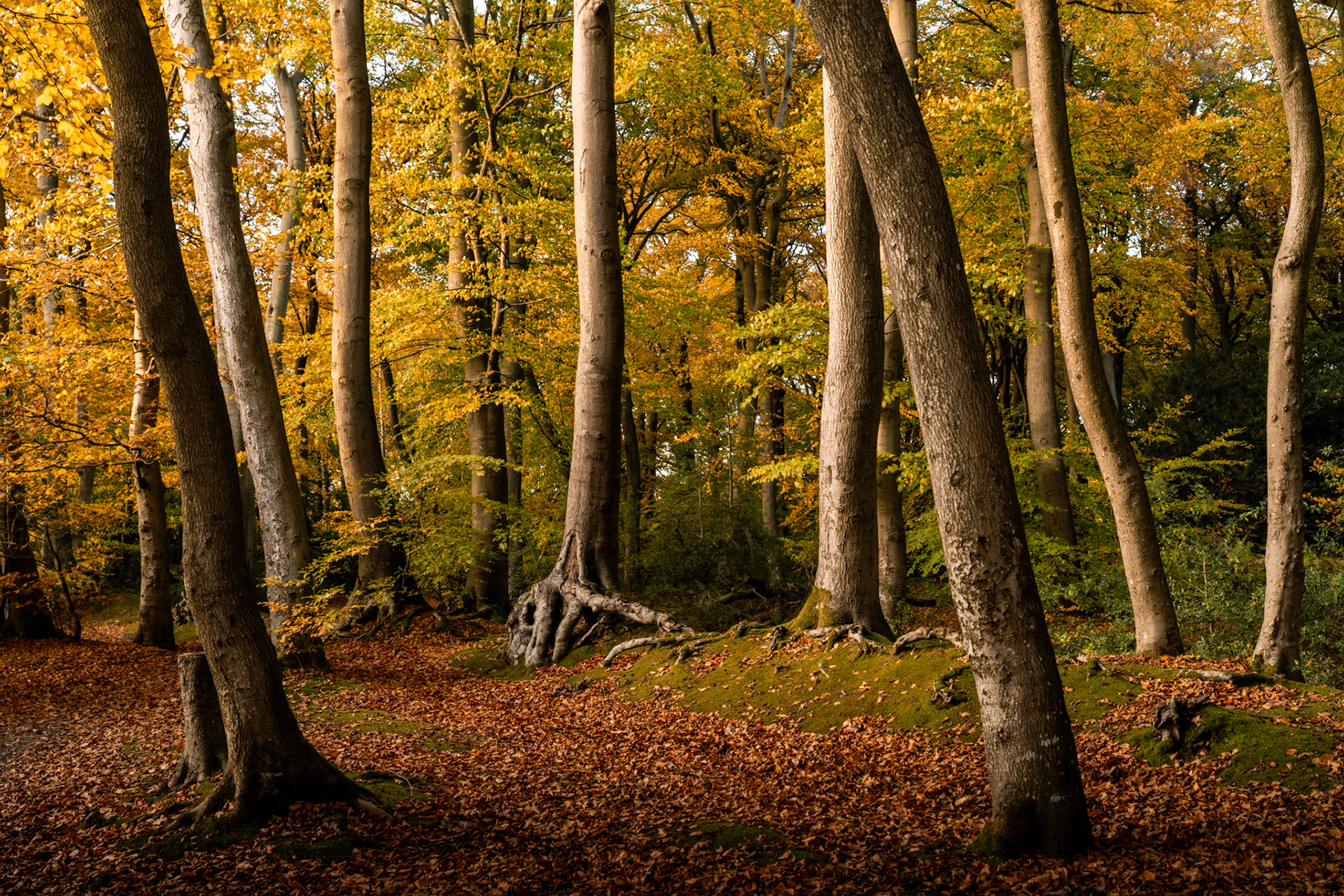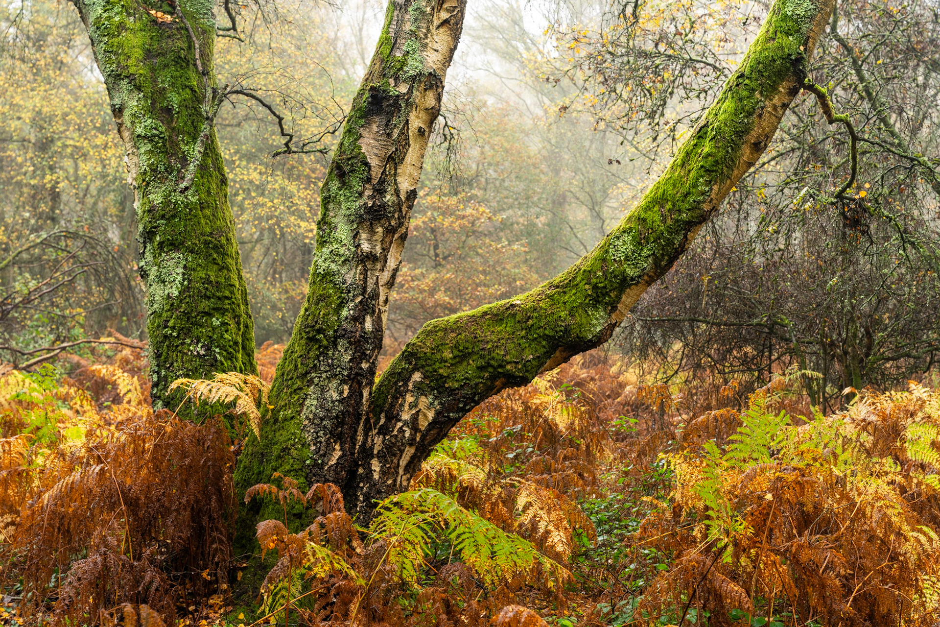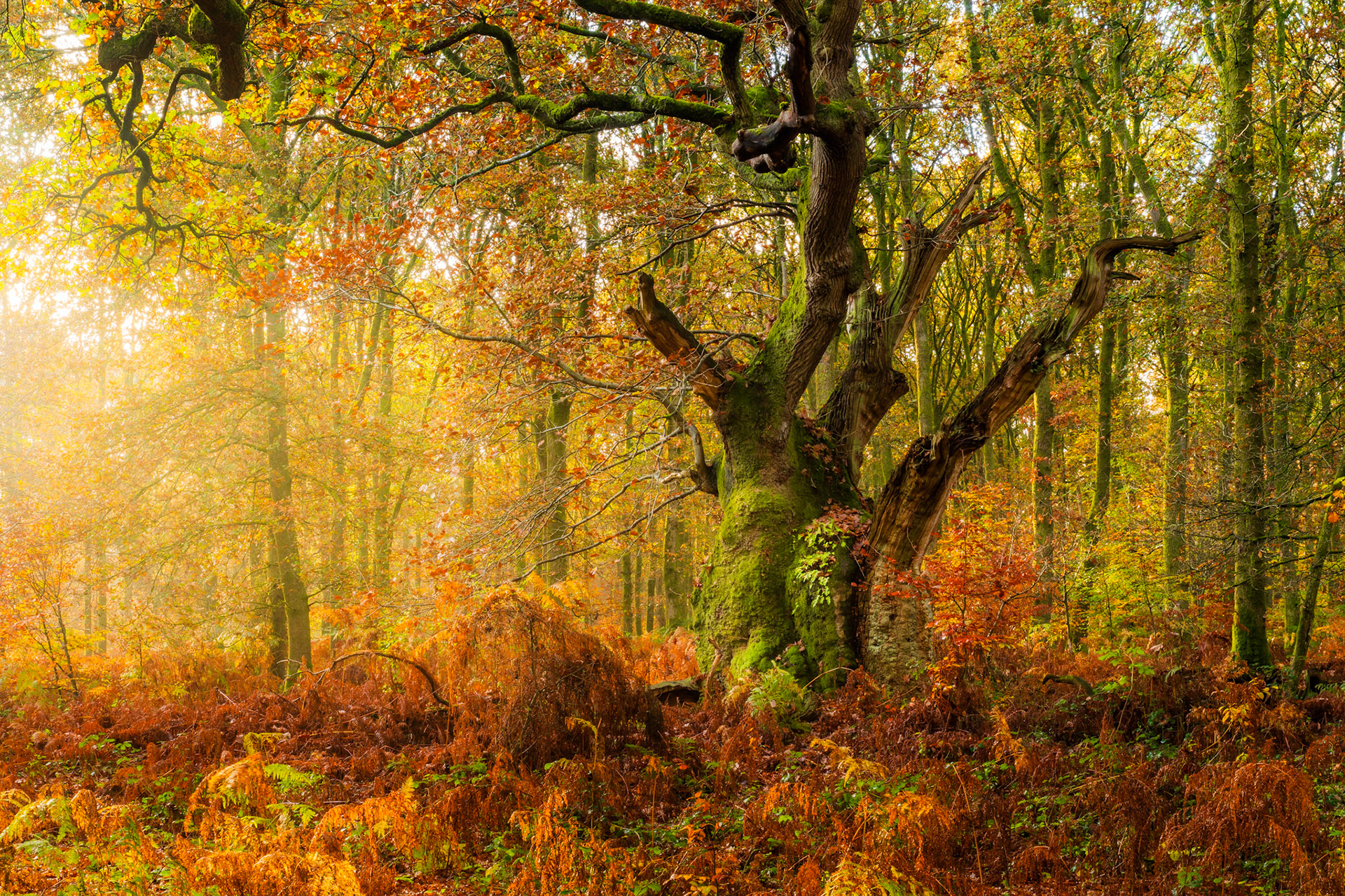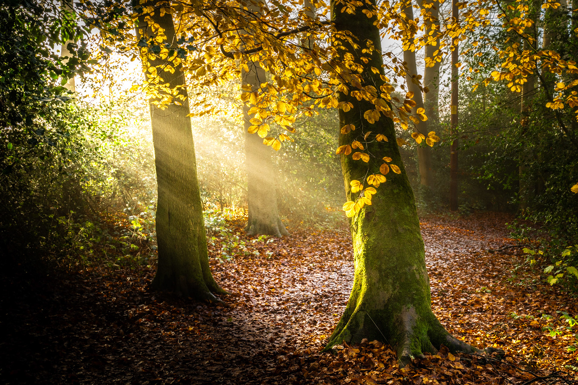 The lower branches of this Beech tree stand alone against it's neighbouring trunks. Golden leaves stand out against the fog, creating a brilliant focal point.