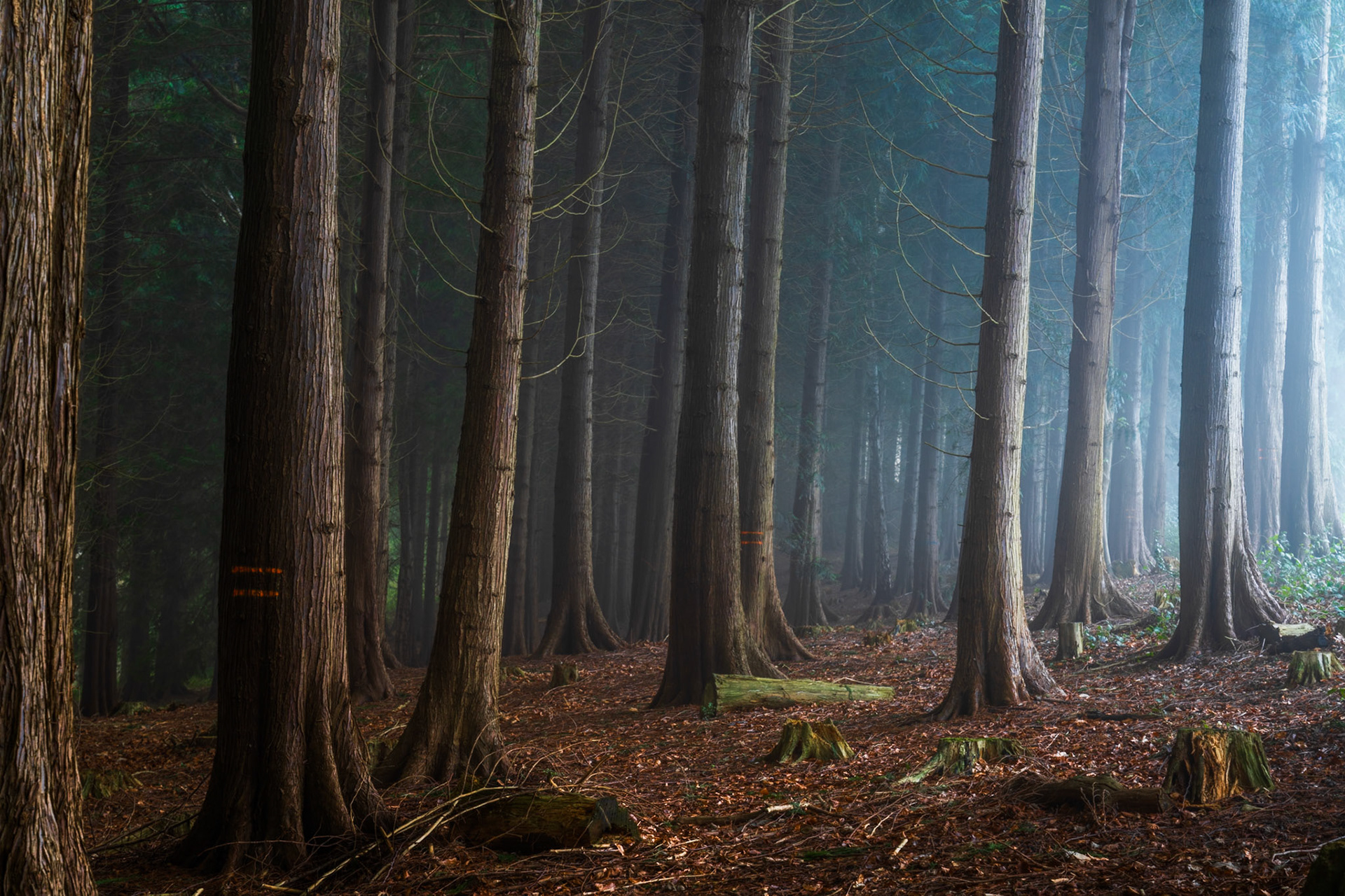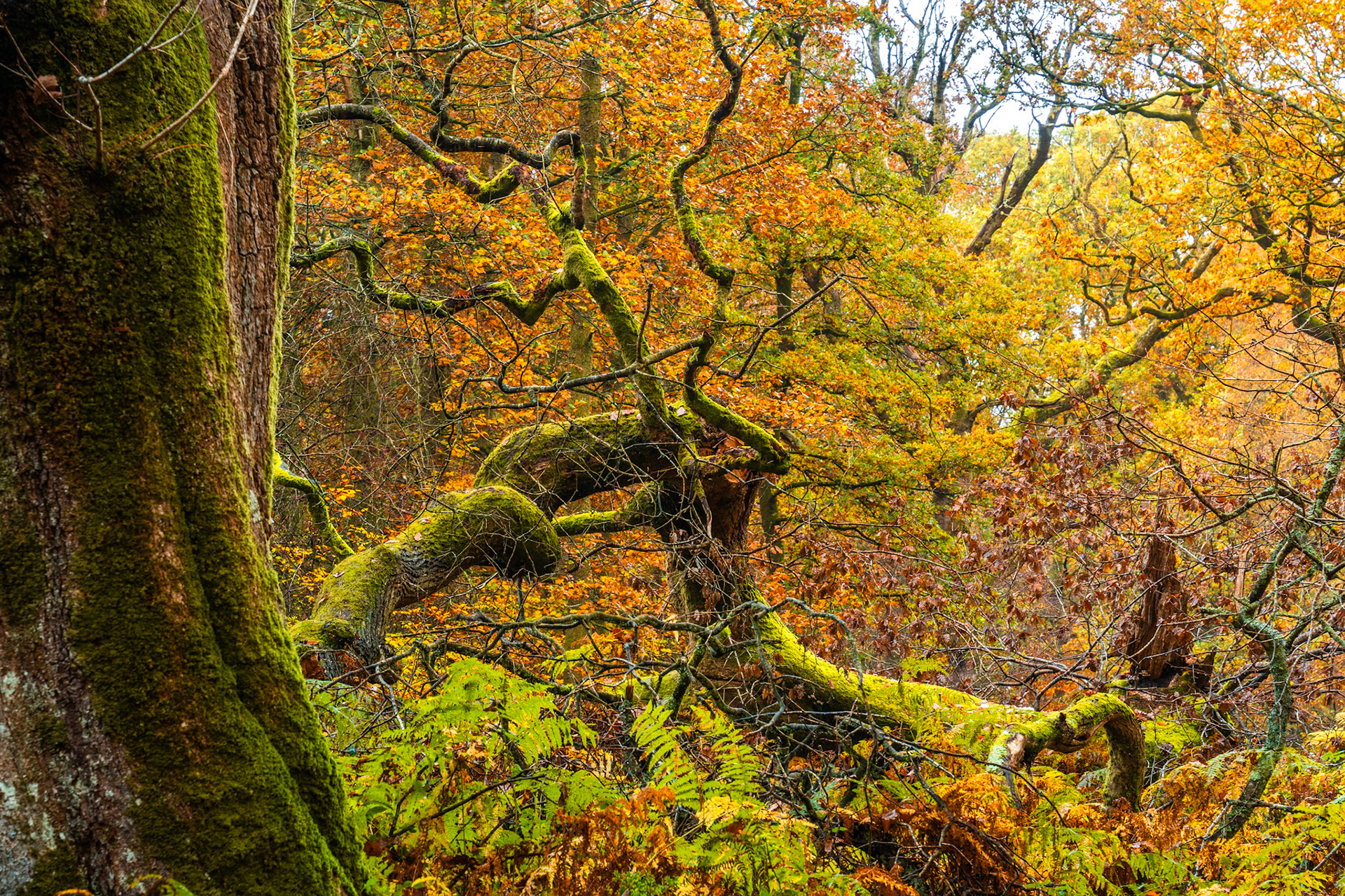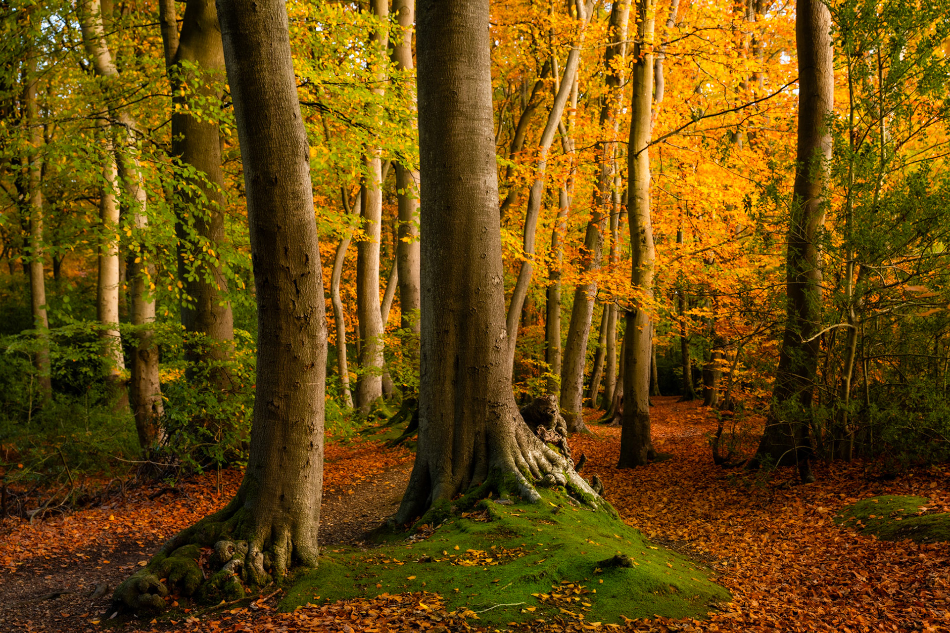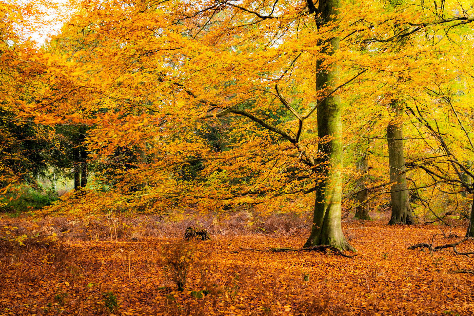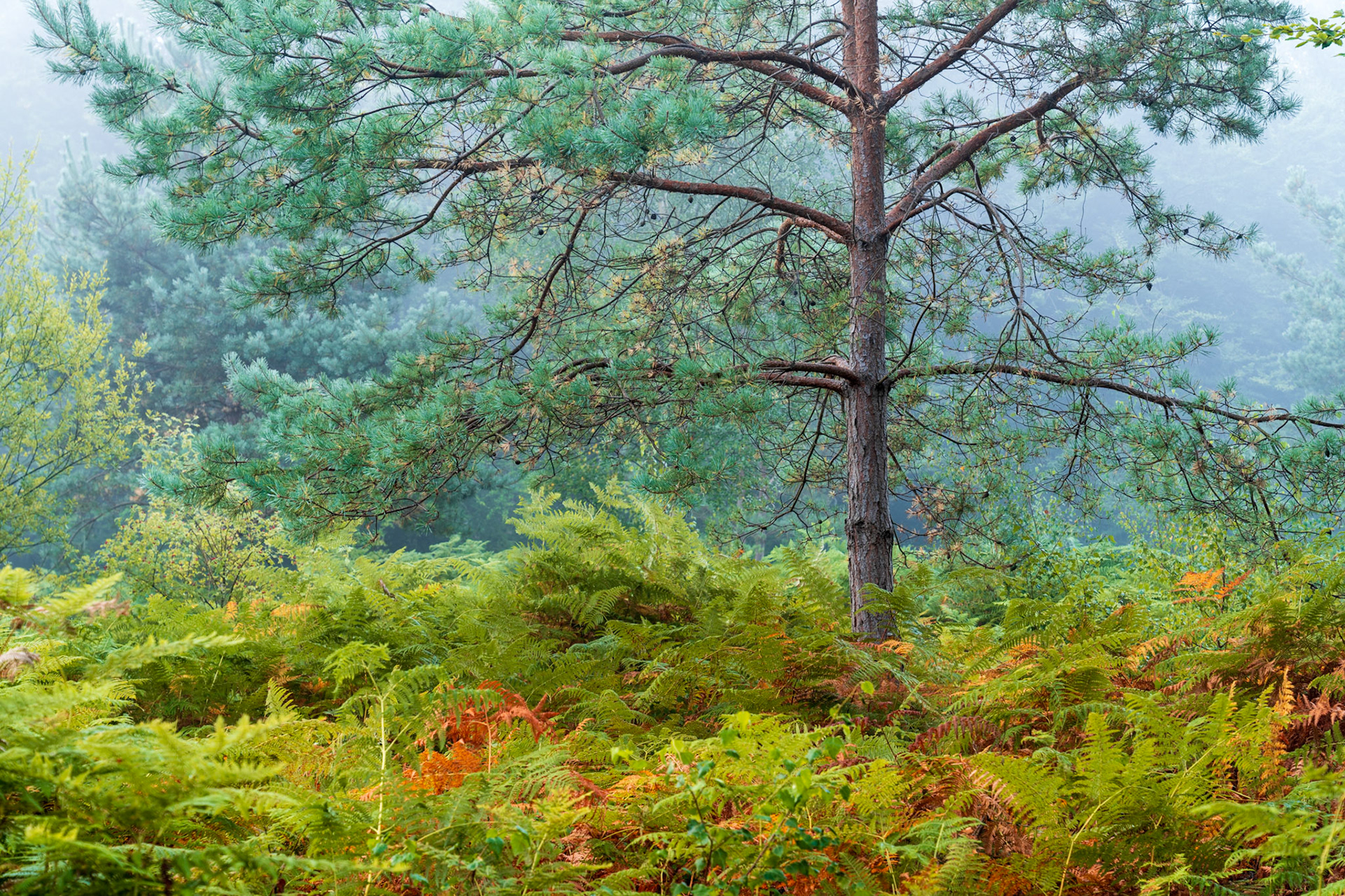 The lower branches of this Beech tree stand alone against it's neighbouring trunks. Golden leaves stand out against the fog, creating a brilliant focal point.
