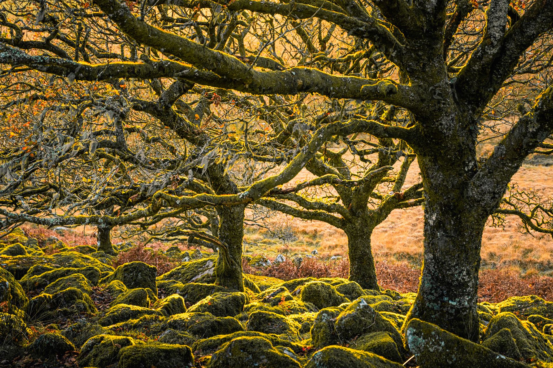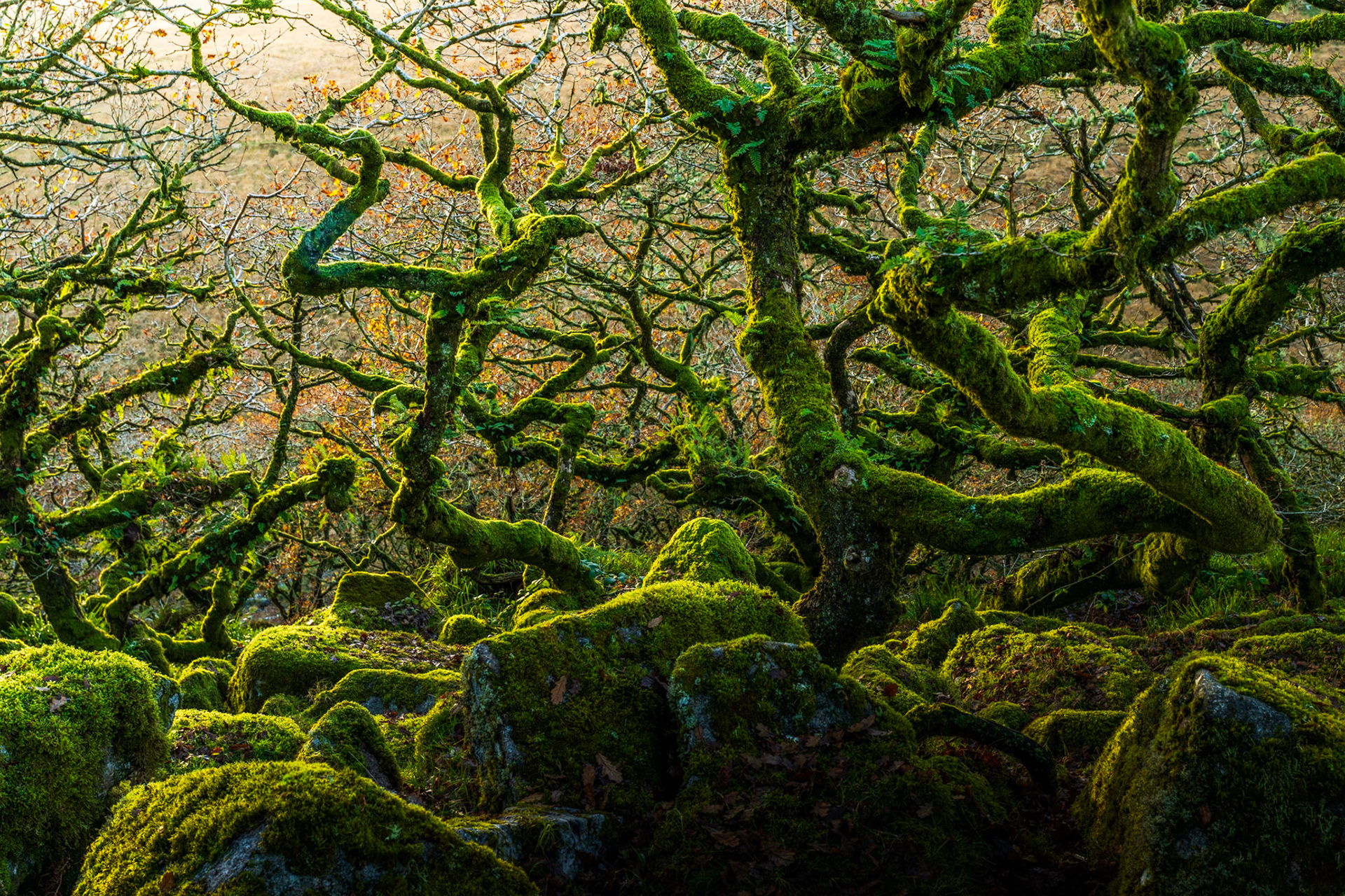 The Wizard, an ancient but dead oak tree standing wisely against younger beech/birch trees. England