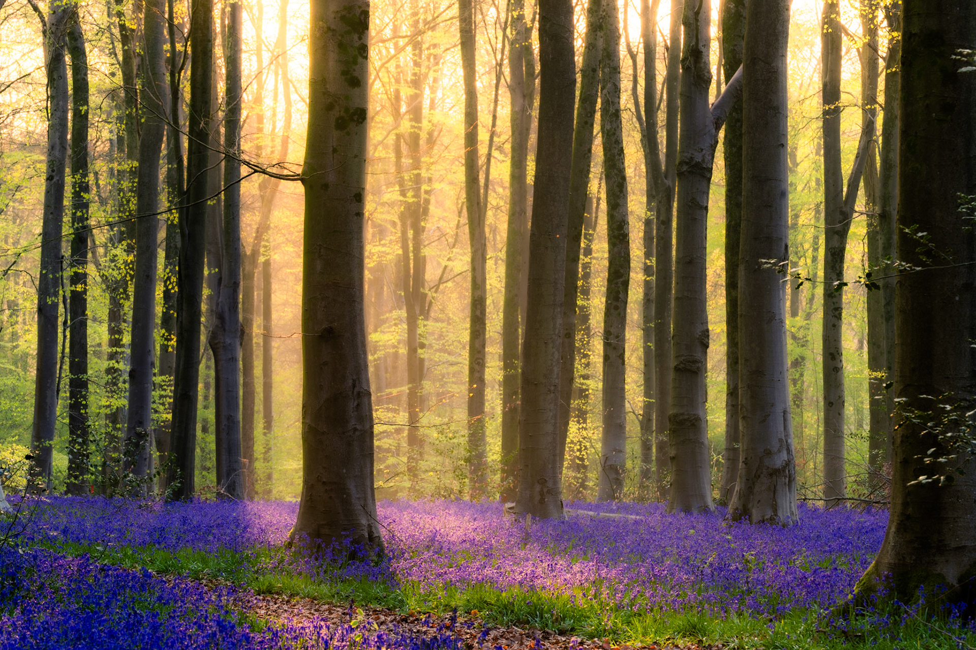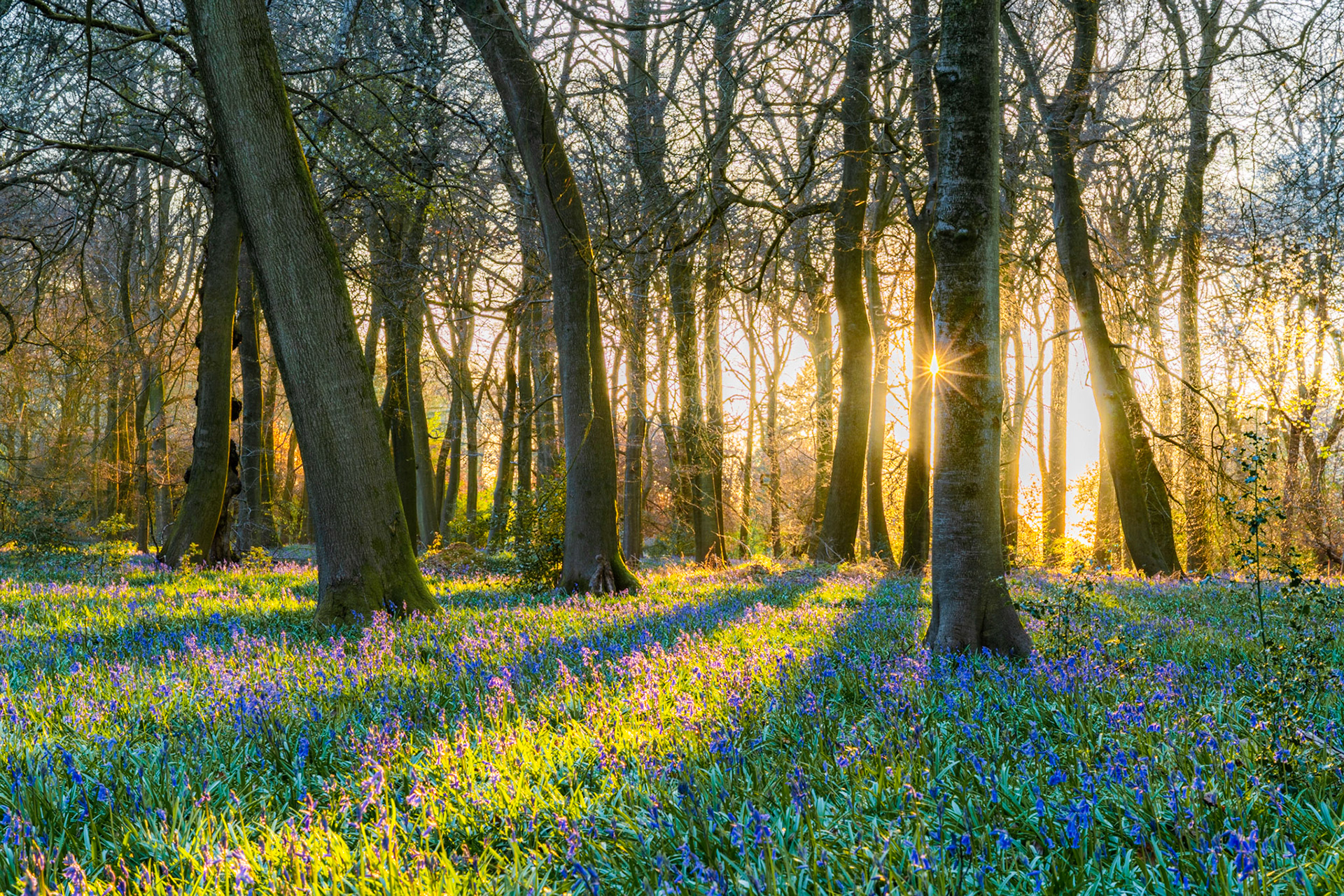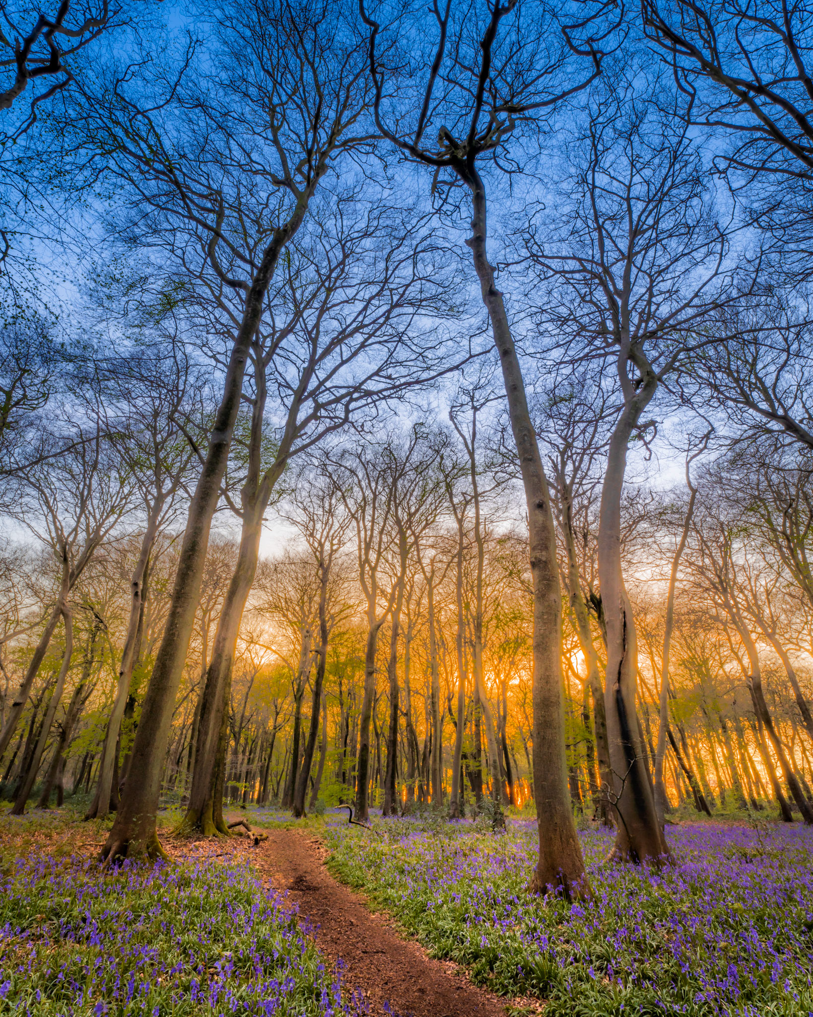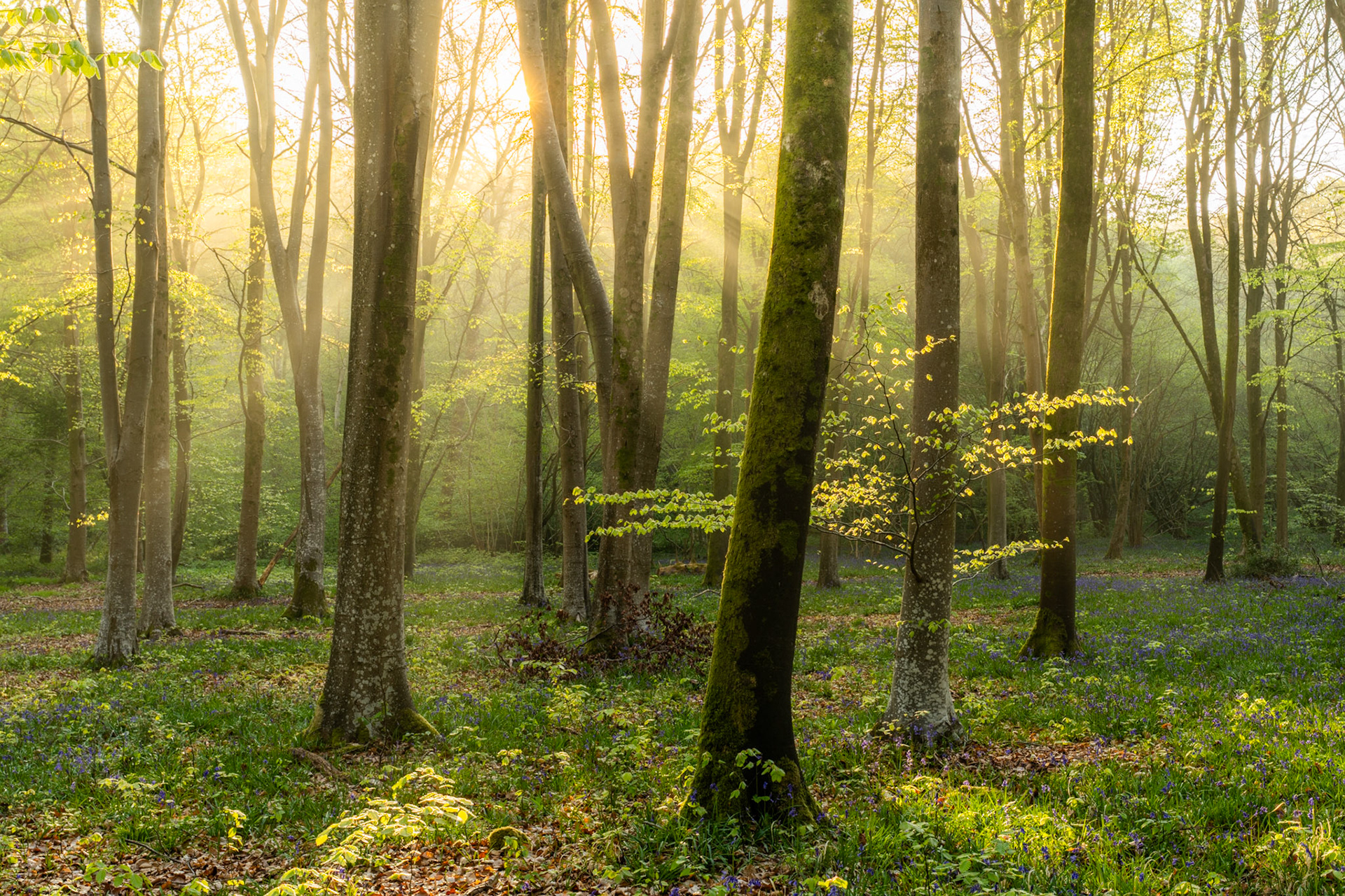 Beautiful old beech trees stand backlit from the golden sunrise, where bluebells carpet the woodland floor. A branch looks to be floating above the bluebells in the wonderful springtime conditions.