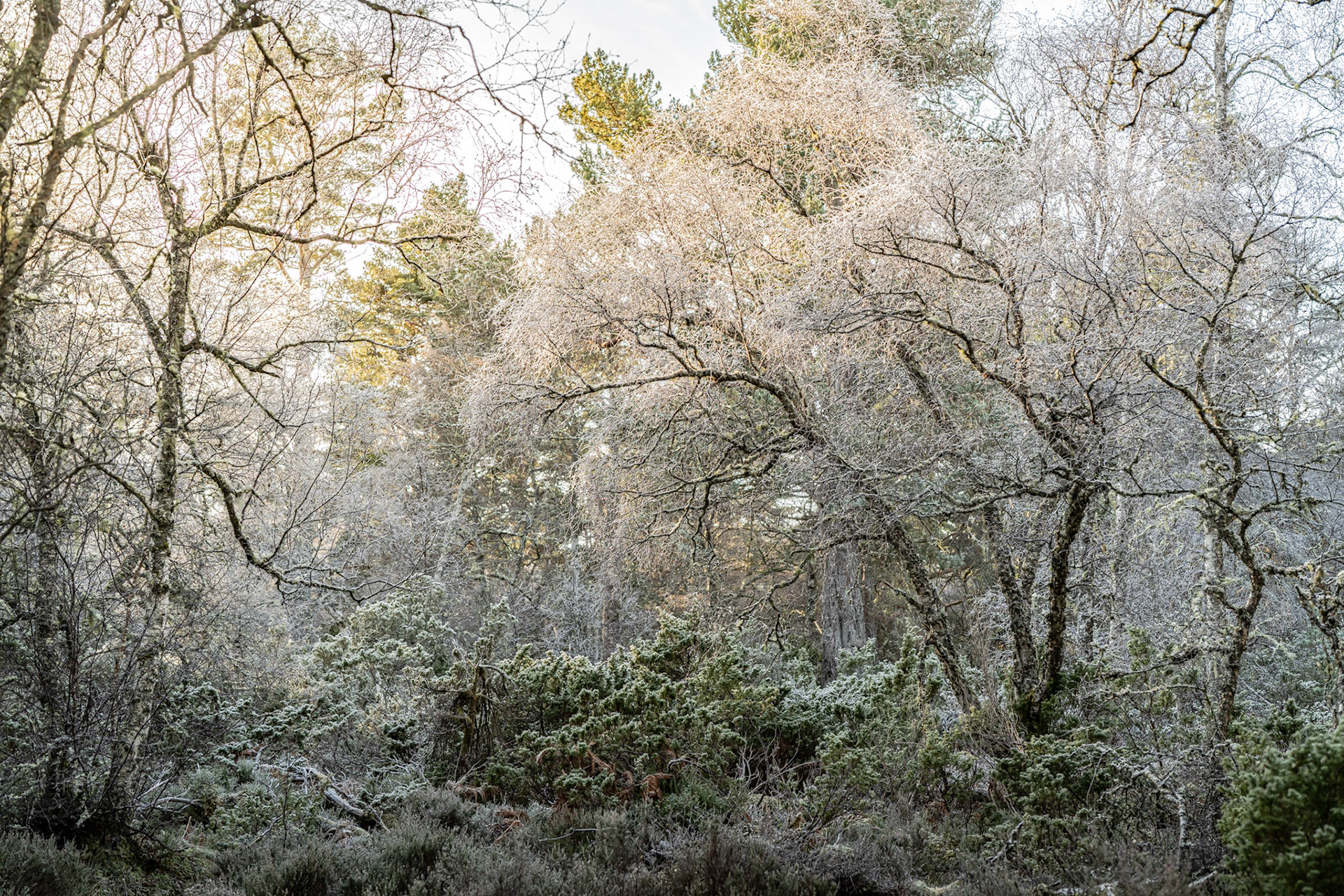Frozen snow covered ancient woodland in the Cairngorms National Park, Scotland