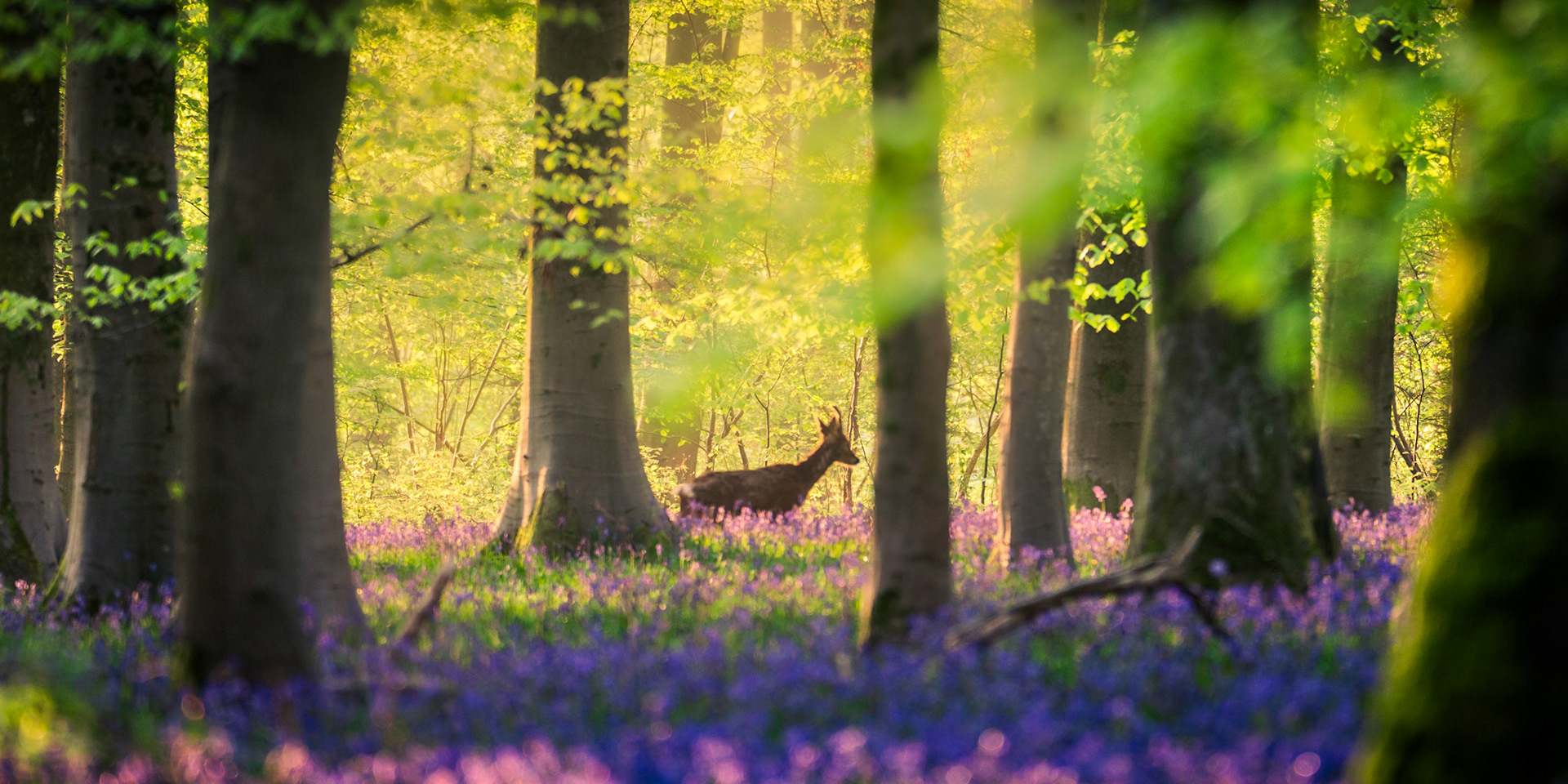 A beautiful roe deer stands patiently amongst bluebells and beech trees in this sunrise capture from Micheldever woodland.